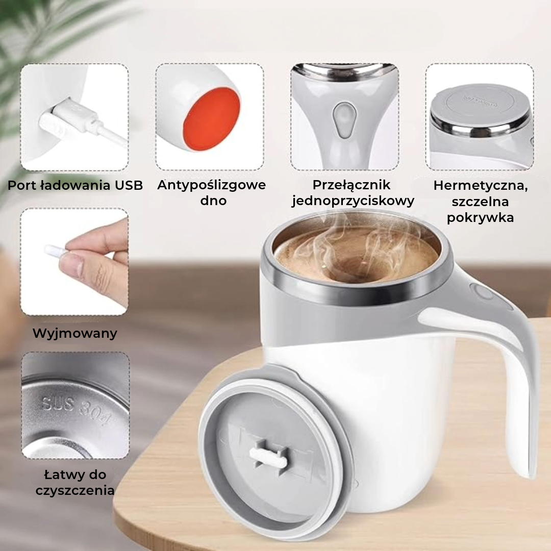 Wyobraź sobie: bierzesz łyk swojej kawy, herbaty lub koktajlu białkowego i czujesz idealnie wymieszany, bezgrudkowy napój – bez potrzeby mieszania. Koniec z niewygodnymi łyżkami, koniec z proszkiem opadającym na dno, tylko czysty, równomierny smak za jednym naciśnięciem przycisku.