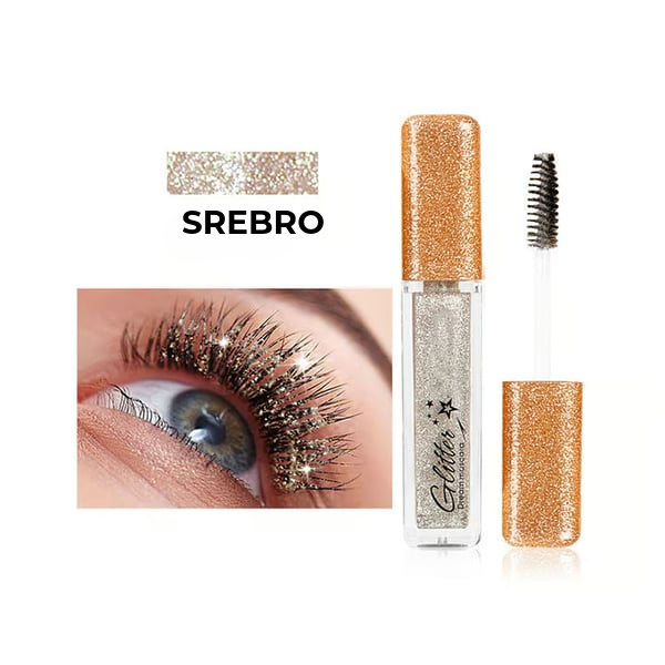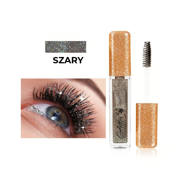 Ergonomiczna spiralna szczoteczka zapewnia idealnie rozdzielone i pełne objętości rzęsy. Każdy włosek jest równomiernie pokryty lśniącym brokatem.