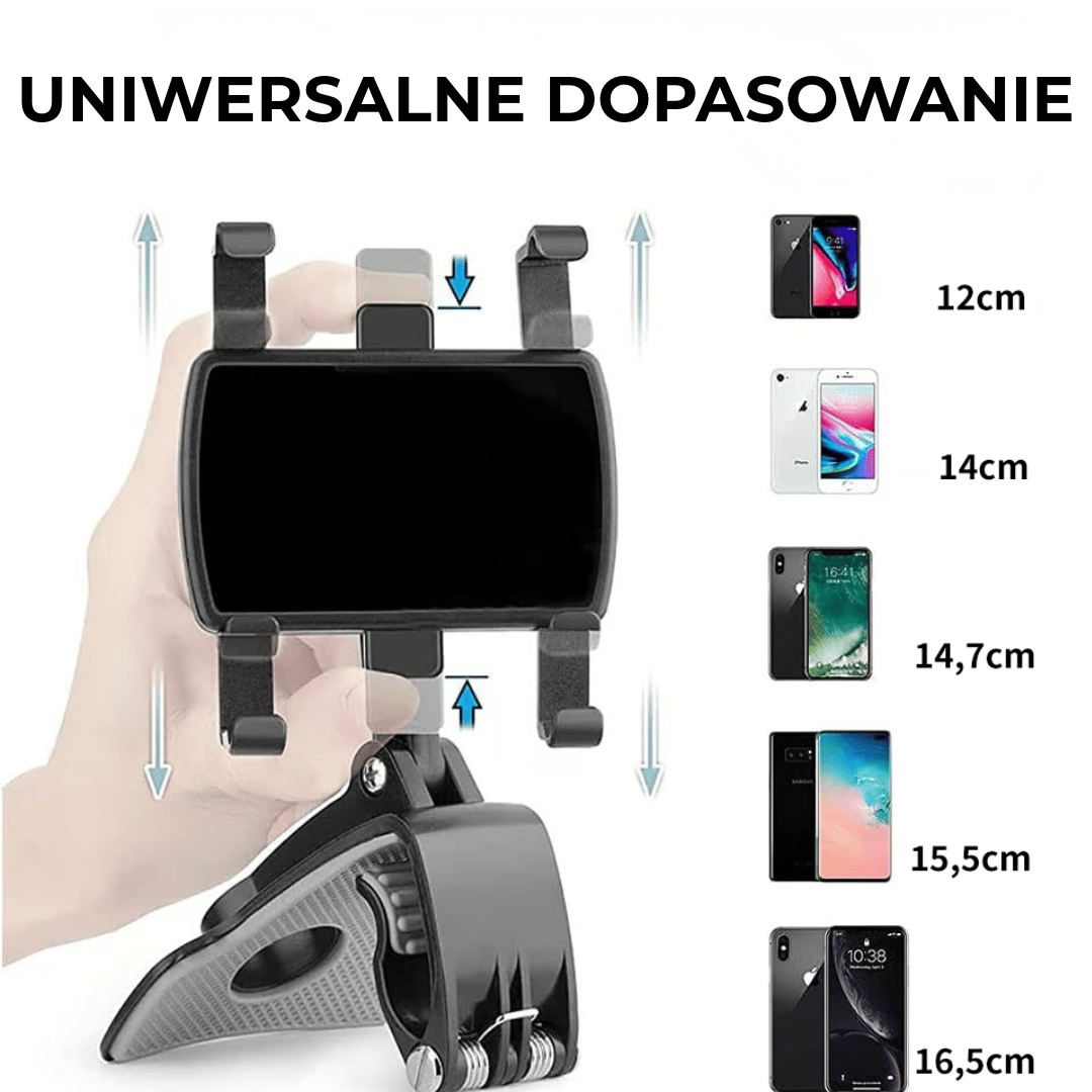 Bez względu na to, czy masz iPhone'a, Samsunga czy inne urządzenie, regulowane ramiona zacisku dopasowują się do telefonów o wymiarach od 7,6 do 17,8 cm. Jeden uchwyt dla wszystkich Twoich urządzeń, idealny zarówno dla dużych, jak i małych smartfonów.