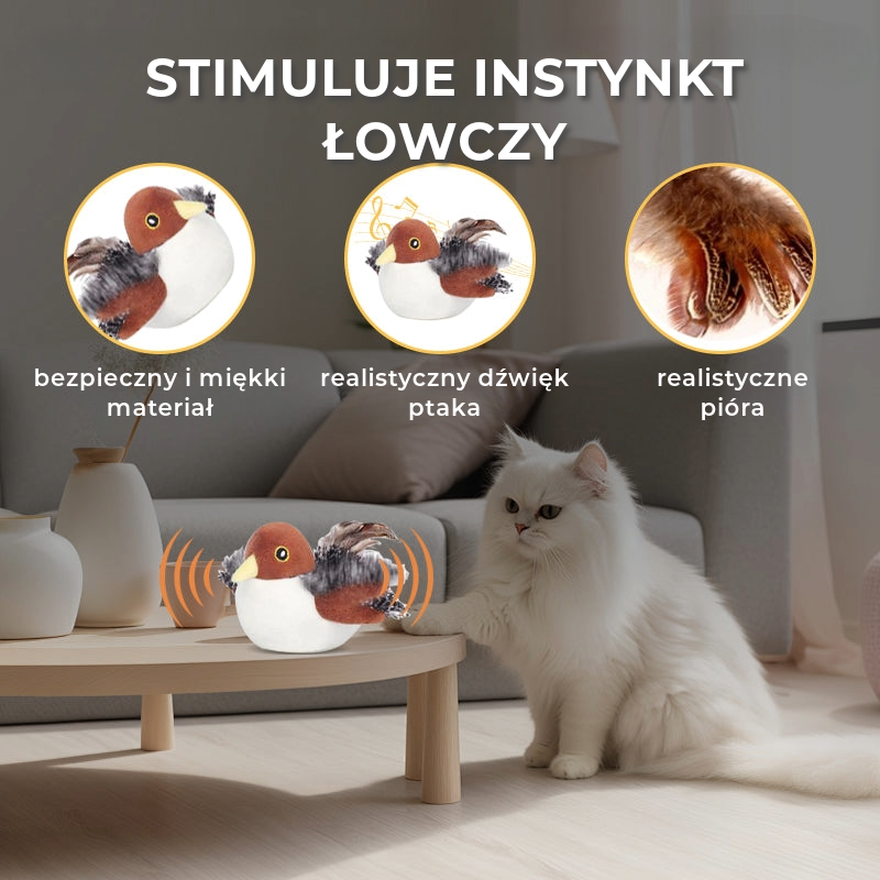 Dzięki realistycznym dźwiękom ptaków i żywym, trzepoczącym skrzydłom, ta zabawka stymuluje naturalny instynkt łowiecki Twojego kota. Idealna do niekończącej się zabawy i stymulacji umysłowej dla każdego kota.