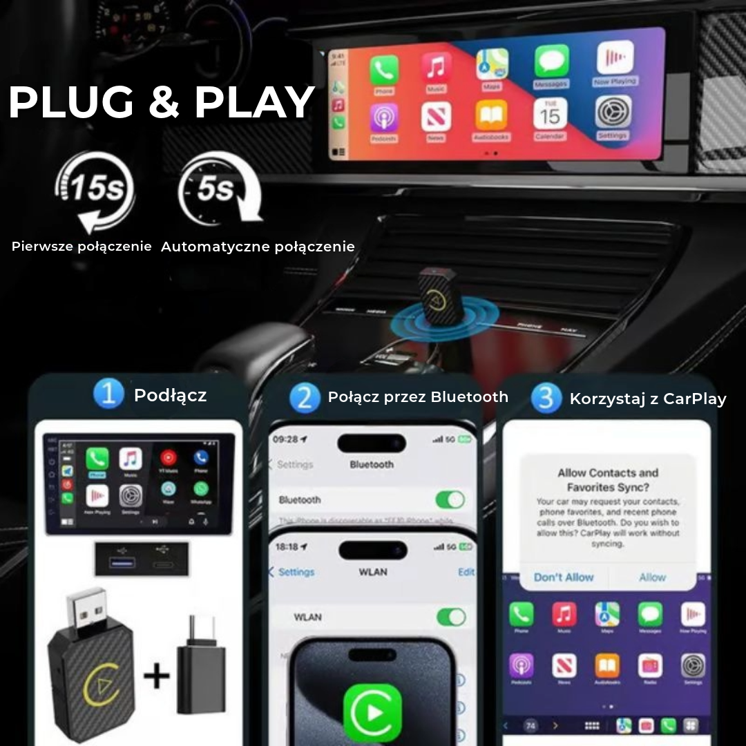 Podłącz adapter, sparuj telefon i gotowe! Po pierwszej konfiguracji urządzenie automatycznie łączy się przy każdym uruchomieniu samochodu. Prosto, szybko i bezproblemowo – już nigdy nie będziesz musiał ręcznie parować telefonu.
