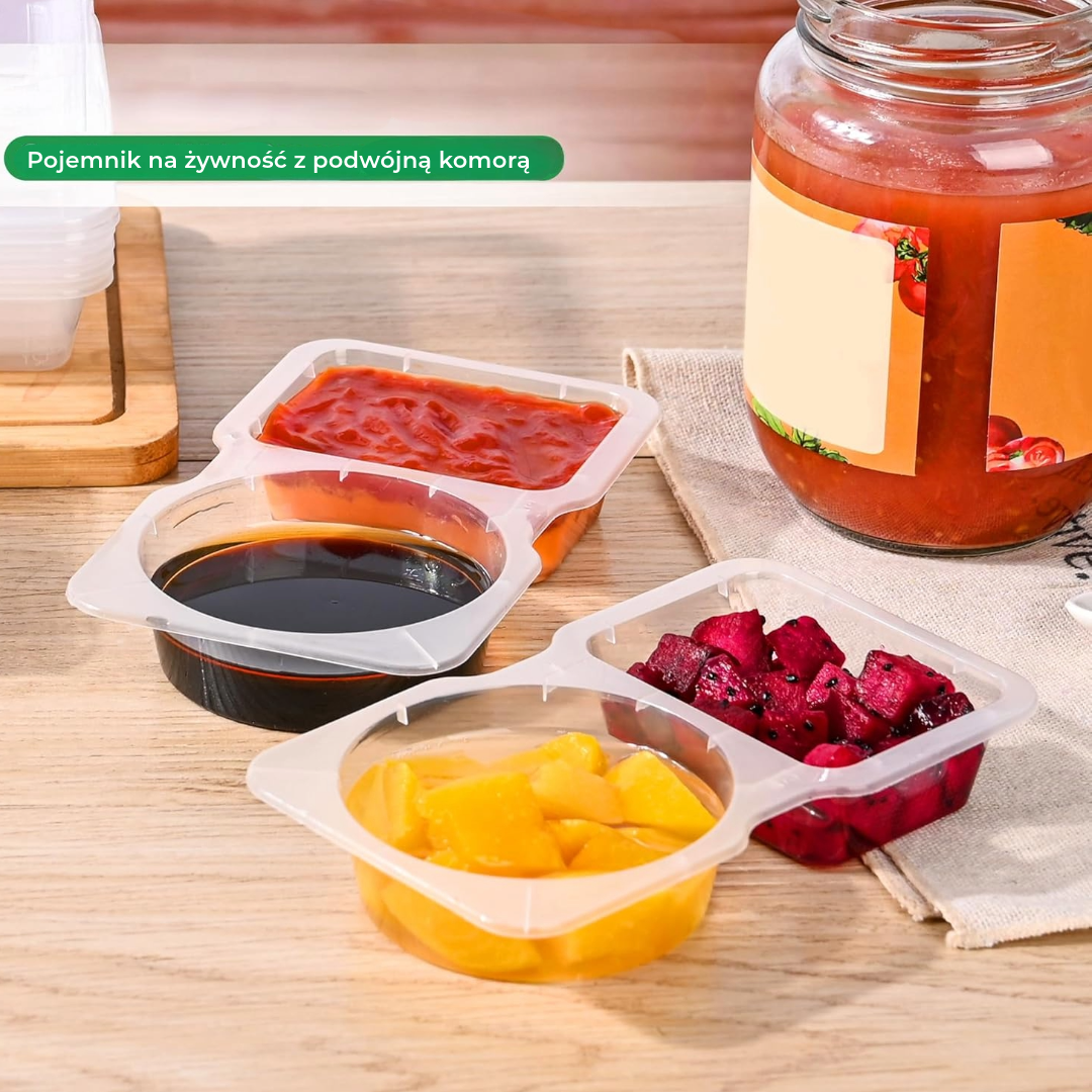 Koniec z bałaganem wielu pojemników! Dzięki sprytnemu podwójnemu przedziałowi możesz przechowywać dwa różne sosy, dipy lub przekąski w jednym wygodnym pojemniku. Smaki pozostają oddzielone, a Ty zawsze cieszysz się świeżym i uporządkowanym posiłkiem.