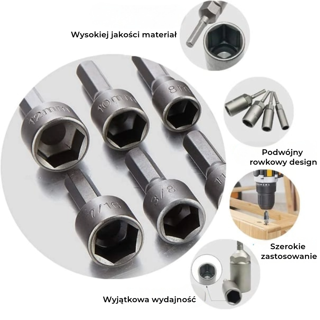 Wykonane z wysokiej jakości stali chromowo-wanadowej, odpornej na zużycie i korozję, te 14 końcówek (5-12 mm i 3/16-7/16 cala) posłużą Ci przez lata. Koniec z połamanymi narzędziami — poczuj się pewnie z zestawem tak mocnym, jak Twoja praca!