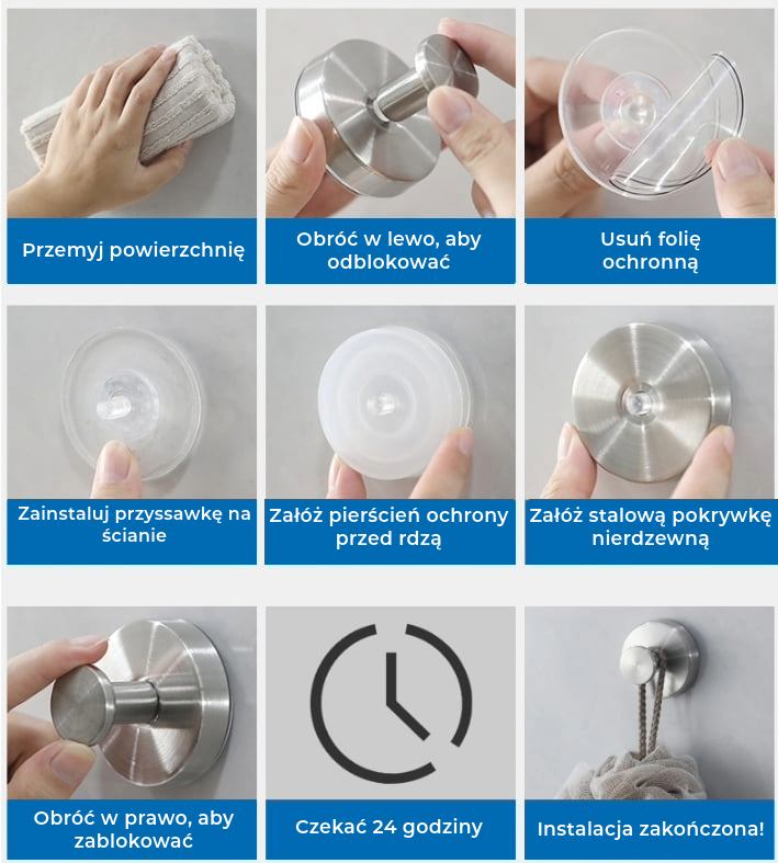 Już nie potrzebujesz wiertarki, śrub ani otworów! Po prostu umieść hak w odpowiednim miejscu, obróć, aby zablokować, i voilà, hak trzyma się mocno!